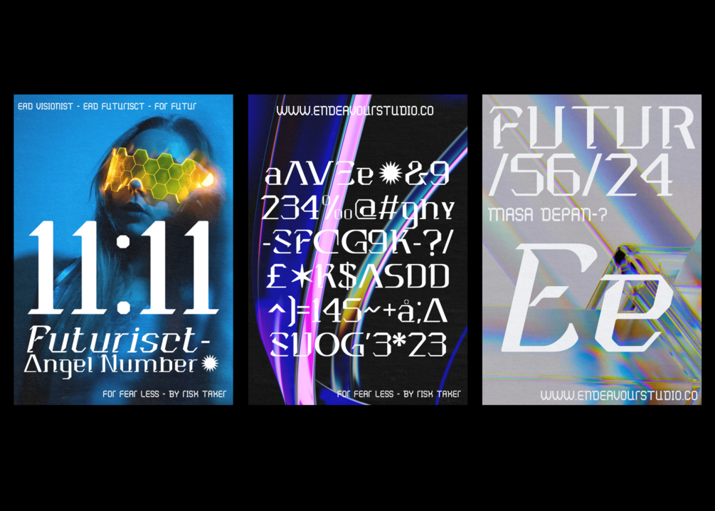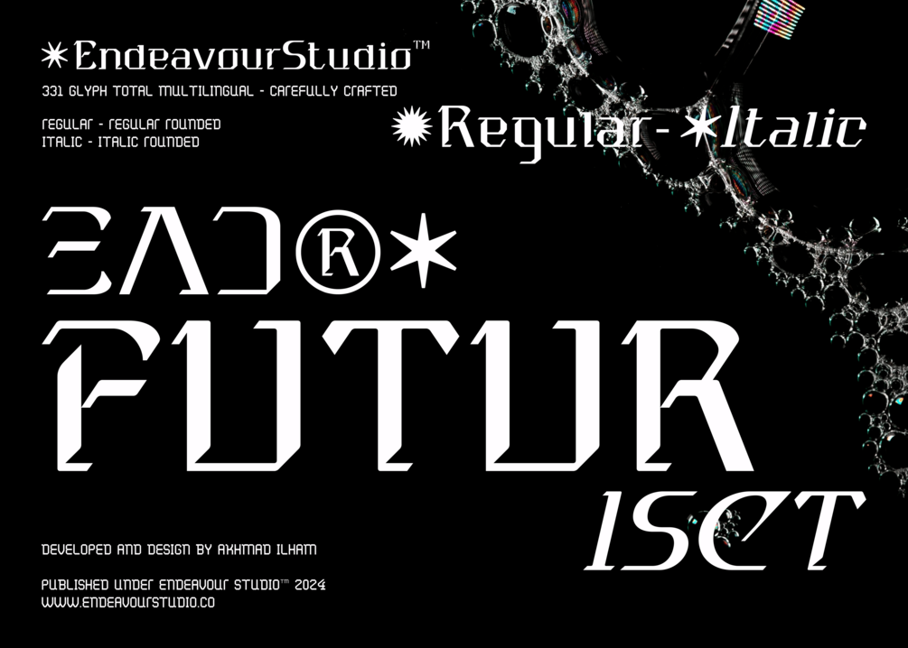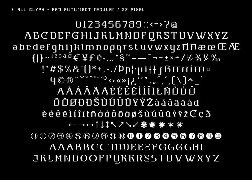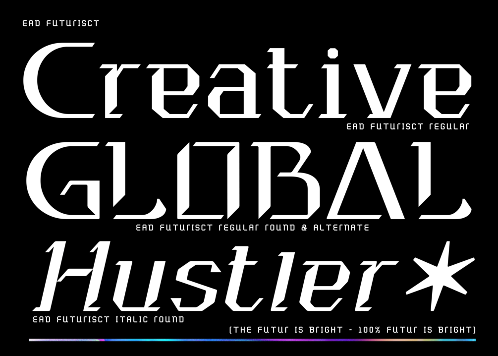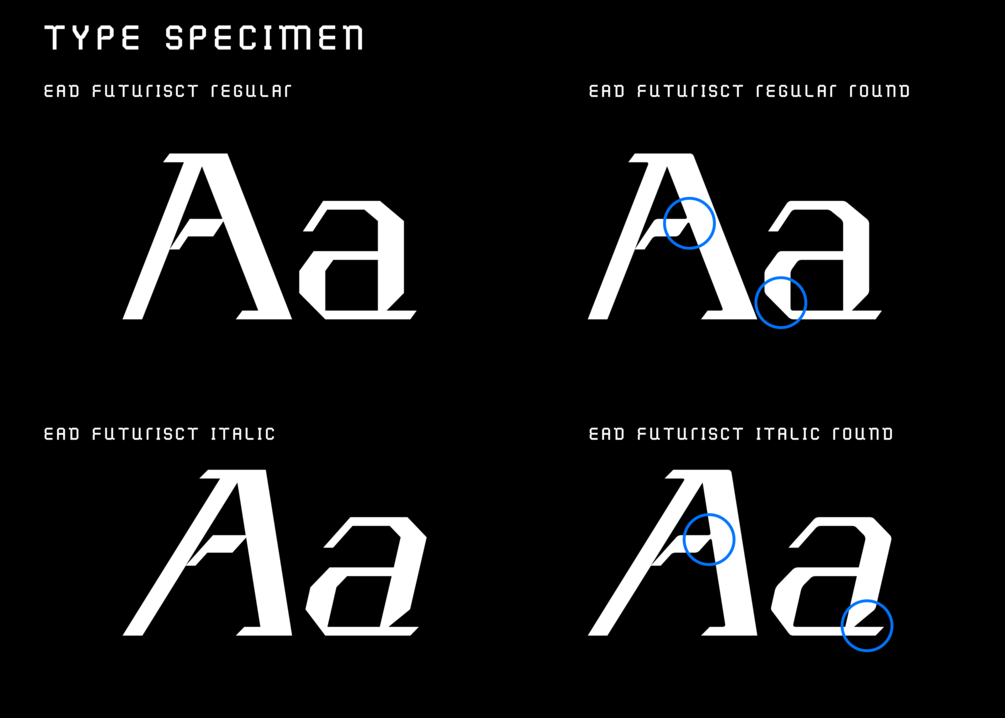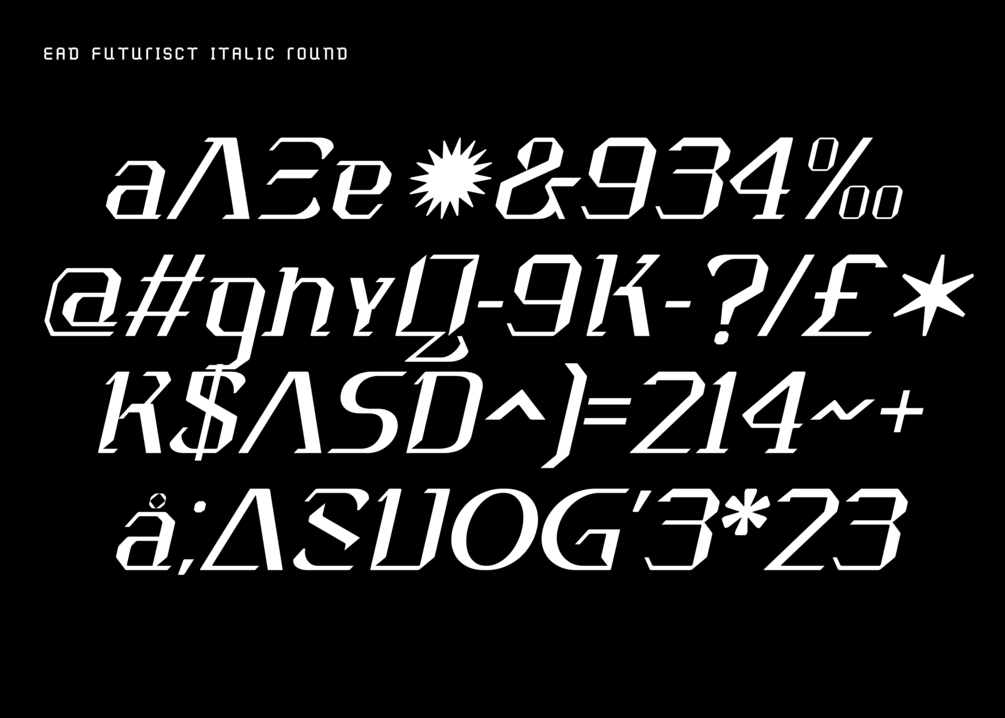 EAD®✶ Futurisct is our experimental typeface, exploring how we can harmonize inconsistency to achieve balance through asymmetrical design, contrast, and shape. Inspired by bold futuristic aesthetics, Futurisct aims to strike a balance between exploration and consistency, even with sharp edges. Once we've achieved the sharp version, we deliberately introduce inconsistency by rounding the corners, creating a more fluid yet still sharp iteration of EAD®✶ Futurisct.